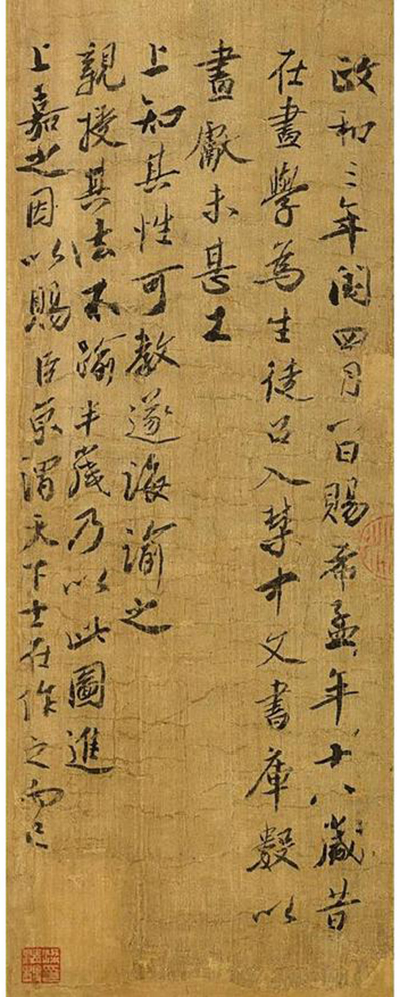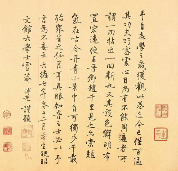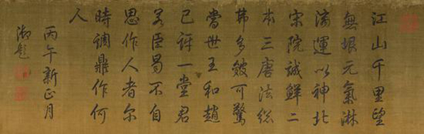 政和三年闰四月八日赐。希孟年十八岁,昔在画学为生徒,召入禁中“文书库”,数以画献,未甚工。上知其性可教,遂诲谕之,亲授其法,不逾半岁,乃以此图进。上嘉之,因以赐臣京,谓天下士在作之而已。