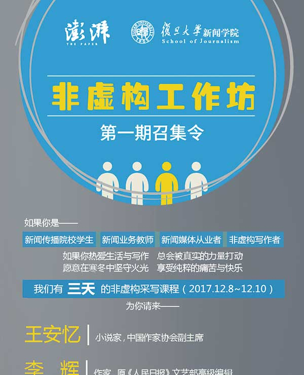 近日,澎湃新闻与复旦大学新闻学院联合成立非虚构写作工作室,并将于12月8日到10日在复旦大学启动第一期“非虚构工作坊”。