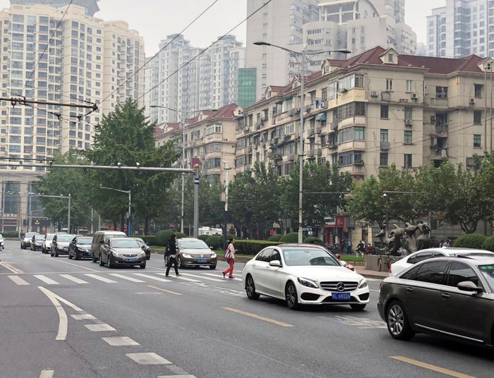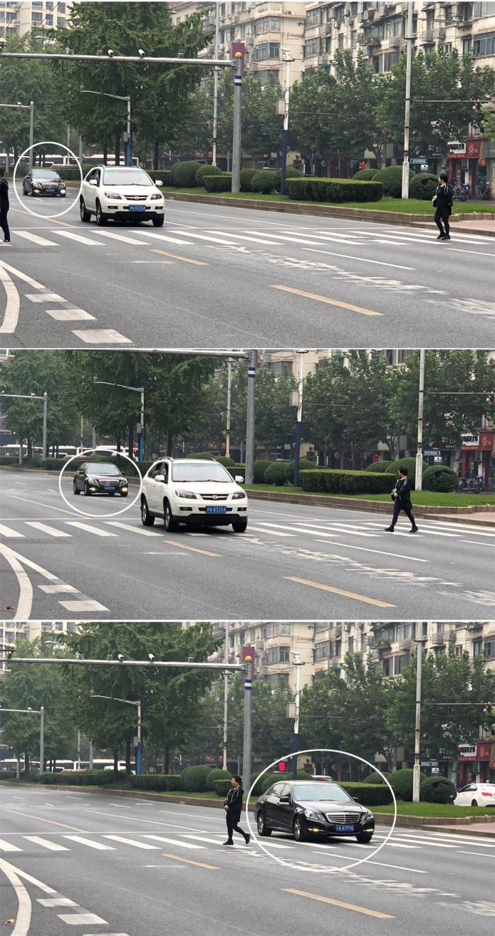 9时28分,一名中年妇女由南向北过街,进入北侧路面后,刚踏上横道线,眼前方的第2根车道上,一辆沪A奔驰车正疾速驶来,丝毫没有减速的意思,会让人吗?能不能往前走?中年妇女决定和车“争一争”。她加快脚步,尽快通过了第2根车道,但奔驰从她身后“擦身而过”。更多的情形,则是行人不敢与车“争”,乖乖地站在横道线上等车走了,再行通过。