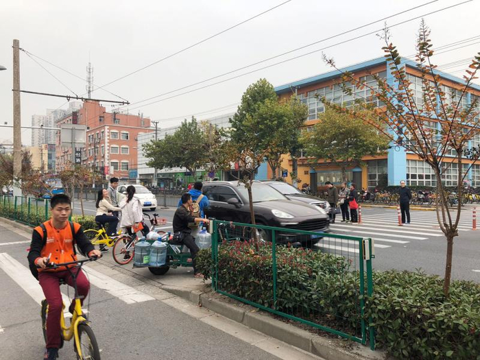 营口路600弄附近的情形相比长寿路更为惊险。这里是黄兴公园门口的一条过街横道线,位于轨交站附近,又有幼儿园和培训机构分布,过街的人流非常密集;而由于营口路这条主干道也仅有双向两车道,车辆亦十分密集。幼儿园正值放学,不少老人带着孩子必须经由这条横道线过马路。