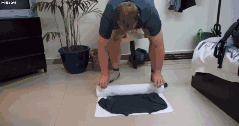 拿出酒店的浴巾,把衣服平铺在上面,然后卷起来,两段对折后,上去踩踩踩。不过小编不建议像动图里这样直接放在地板上,可以在地上铺一层塑料袋~踩5分钟后拿出来看看,你绝对不敢相信你的眼睛!