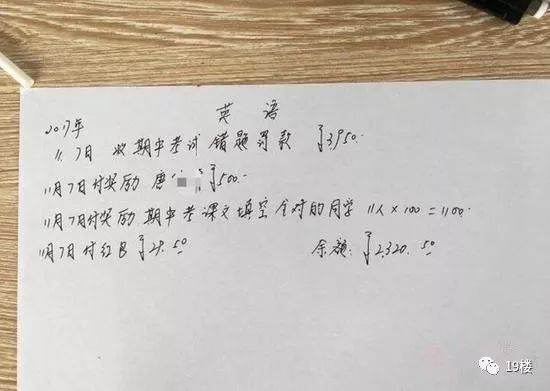 通过这份“账单明细”可以看到,仅11月7日这天因期中考试错题收到的罚款就高达3950元,这些罚款支付于奖励学生唐某500元,奖励期中考语文填空全对的同学1100元,付红包29.5元,余额2320.5元。
