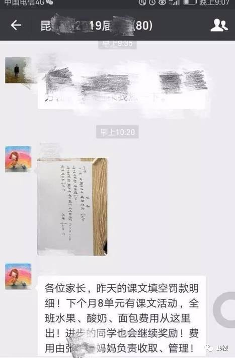 该教师还向群里的家长公布,下个月课文8单元有实践活动,全班水果、酸奶、面包费也会从罚款中支出,进步的同学也会继续奖励,费用由家委会某位学生家长负责收取、管理。