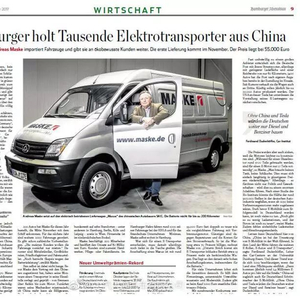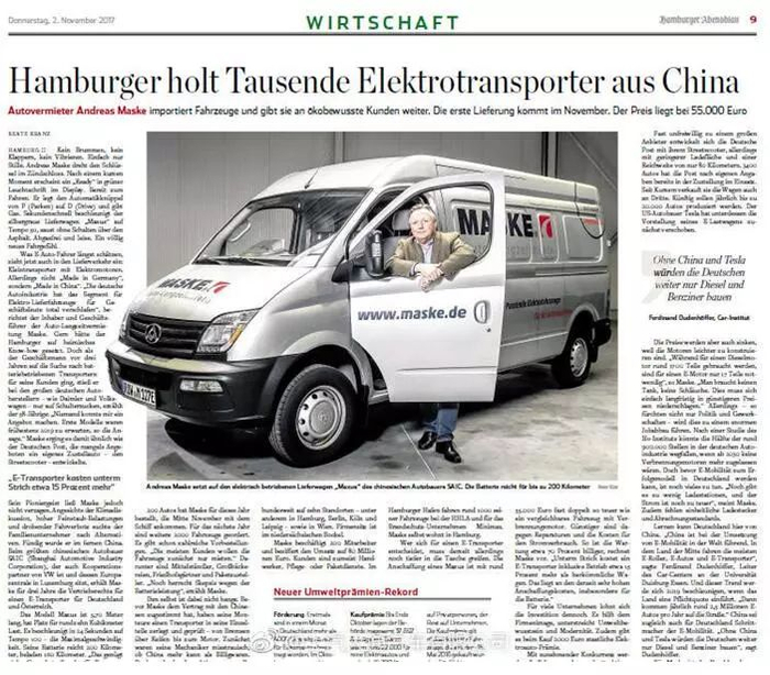 首次采购大通EV80的Maske集团,租赁业务覆盖汉堡、柏林、科隆、莱比锡等德国主要城市,以及奥地利首都维也纳。现在Maske获得了EV80在德国以及奥地利为期三年的分销权。据了解,Maske公司今年订购的200辆EV80将于11月中旬抵港,明年还将预定2000辆。
