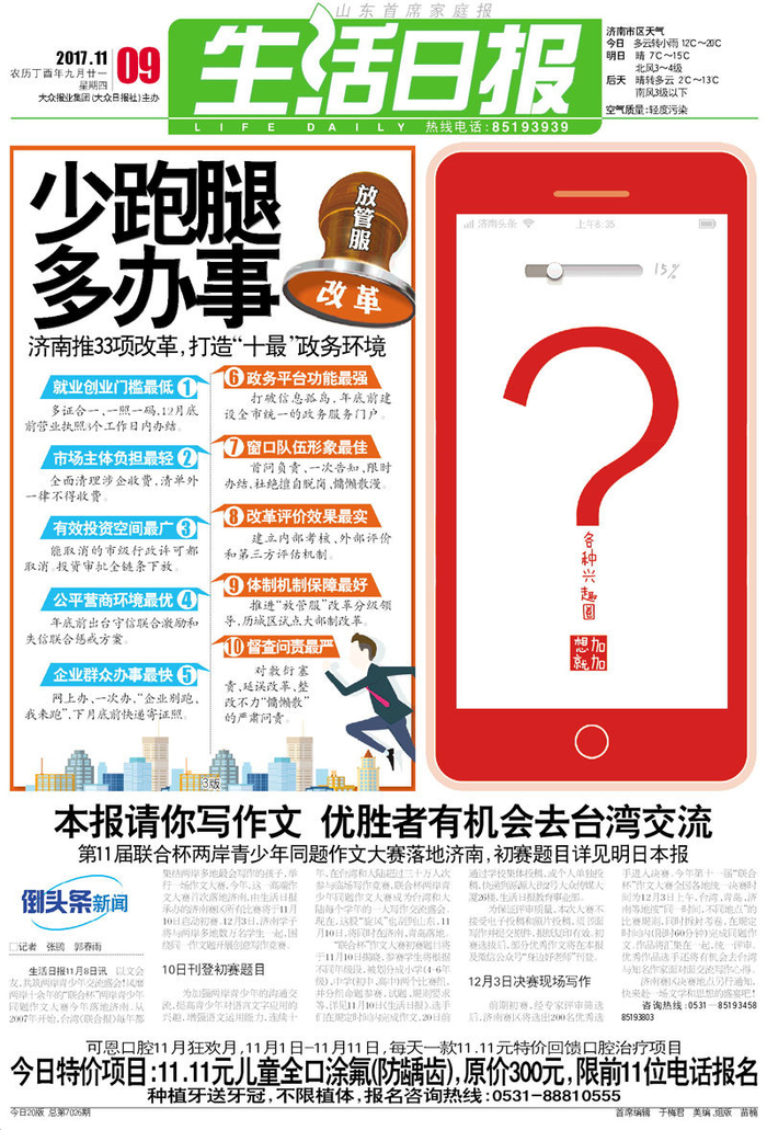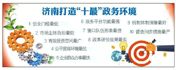 8日上午,济南市委市政府召开新闻发布会,对近期出台的《关于打造“十最”政务环境 助推济南新旧动能转换的实施意见》作出权威解读。实施意见确定33项改革目标任务,提出打造“十最”放管服济南版。“十最”包括创业门槛最低、市场主体负担最轻、有效投资空间最广、公平营商环境最优、企业群众办事最快、政务平台功能最强、窗口队伍形象最佳、改革评价效果最实、机制体制保障最好、督查问责措施最严。文件提出的33项改革举措,均明确了牵头单位、责任单位,并对2017年的改革任务细化分解为80项具体工作,逐项落实到部门和明确完成时限,推动改革尽快落地生效。