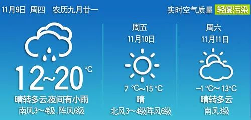 根据济南市气象台预报,8日夜间到9日晴转多云,9日夜间有小雨,南风3~4级,阵风6级,9日早晨最低气温济阳、商河4℃左右,市区及其他县区9℃~12℃,9日最高气温20℃左右。10日晴,北风3~4级阵风6级夜间减弱到2~3级,最低气温济阳、商河5℃,市区及其他县区7℃左右,最高气温15℃左右。11日晴转多云,南风3级,最低气温-1℃~2℃,有冰冻或霜冻,最高气温13℃左右。