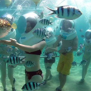 通常,参加这个项目的游客,会先从芭提雅坐船45分钟到格兰岛的一个基地,然后由两名潜水员带领多名游客入水,一直潜至六七米深的海底。游客佩戴由项目方提供的氧气头盔,在海底漫步约30分钟,看一些鱼类和珊瑚。价格约合300-750元人民币(价格可能会有波动)。