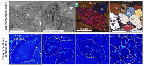 中国科学院广州地球化学研究所岩浆作用与成矿学科组的科研人员,首次对我国攀西地区阿布郎当超镁铁质岩体中自形橄榄石,以及白马岩体中具有海绵陨铁结构的钒钛磁铁矿矿石中浑圆状橄榄石,进行P环带研究。采用高精度电子探针元素面扫描、激光ICP-MS以及电子背散射衍射(EBSD)技术,发现自形橄榄石和浑圆状橄榄石具有显著不同的P环带结构,记录了其不同的生长过程。