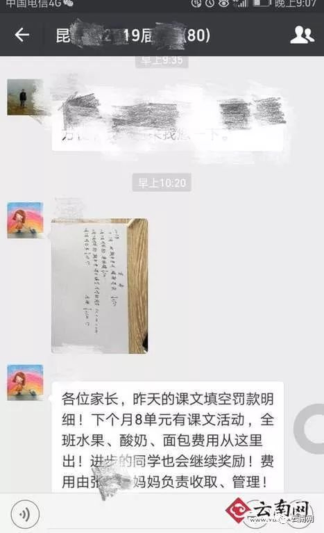 所附截图显示,在昆明某中学2019届初二某班微信聊天记录中,有一张疑似教师发布的手写罚款明细单,上面记录11月7日期中考试英语错题罚款3950元,支付奖励唐某某500元,奖励英语课文填空全对的同学1100元,付红包29.5元,余额2320.5元。该教师还向群里的家长公布,下个月课文8单元有实践活动,全班水果、酸奶、面包费也会从罚款中支出,进步的同学也会继续奖励,费用由家委会某位学生家长负责收取、管理。
