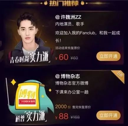 首批开通这一功能的“大V”包括医疗博主@京虎子、@营养师顾中一、科技博主@阑夕、@数据化管理、财经博主@花荣、媒体账号@博物杂志 等,价格从88元到6498元不等。为吸引粉丝成为专属会员,博主均提供了一定数量的限量体验名额。