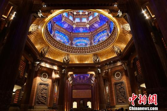 中新网南京11月9日电 (记者 孙权)无锡知名景点灵山梵宫“闭关”一年后,现正准备对外开放。11月9日,记者来到位于无锡马山地区的灵山梵宫内一探究竟:在梵宫新修缮的廊厅中,十二幅庄严明朗的巨型油画《世界佛教传法图》分布在两侧墙体上,镇馆之宝琉璃雕刻《华藏世界》放置于中间,配合栩栩如生的飞天木雕与奇妙壮观的星空穹顶,一如火灾发生前的“模样”。
