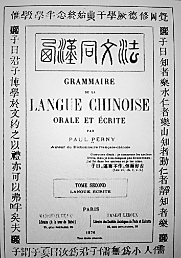 法国汉学家顾赛芬在《法汉常谈》的扉页上径直采用对联的方式,表达自己沟通东西方的豪迈之情。左侧上联为“比事属词惟望东海西海通声气”,指明该书为跨文化交流而作;右侧下联为“黜华崇实敢矜大珠小珠落玉盘”,对自己著作的水准表现出足够的自信;横批为:“开卷有益异言无讥”,希望阅读者能有足够开放的视野和胸怀。