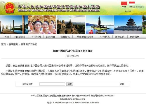 中使馆提醒中国公民 遵守印尼海关相关规定 中国新闻网 2017.11.1009:22 关注 中新网11月10日电 据中国驻印度尼西亚共和国大使馆网站消息,近日,有当地媒体报道,3名中国公民入境时因携带16公斤水稻种子,违反印尼海关及检验检疫规定,被印尼执法人员查扣。 图片来源:驻印尼中使馆网站截图对此,中国驻印尼使馆谨提醒赴印尼中国公民,入境前务必了解并遵守印尼相关规定,携带超过1亿印尼盾现金(约合49000元人民币)、动植物及其制品、影片、录像带、唱片等入境均须申报,如未申报被查获,当事人将受到罚款及没收物品等处罚。