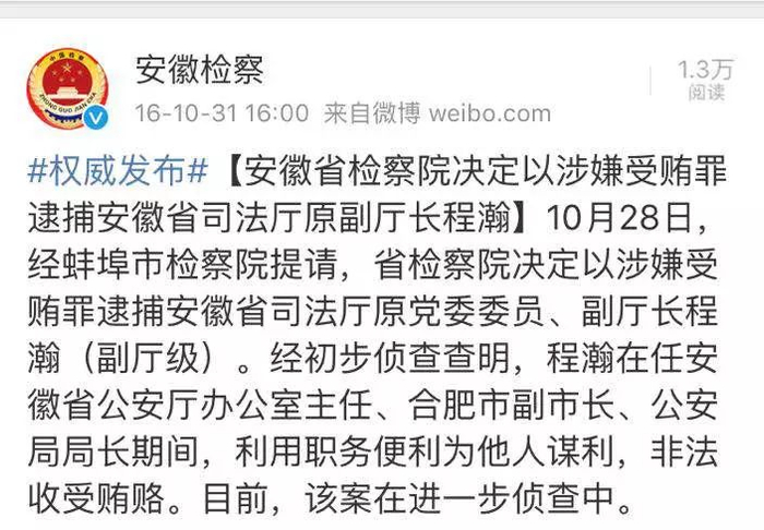 2016年5月18日,安徽纪检监察网发布消息称,程瀚因涉嫌严重违纪,接受组织调查。当年10月28日,安徽省人民检察院对外通报称,程瀚因涉嫌受贿罪被依法逮捕。
