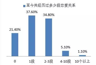 “0段”、“1段”、“2—3段”分别占21.4%、37.6%、34.8%。总计93.8%被访者至今交往的数量少于4人,超过两成的被访者还没有尝试过恋爱的滋味。