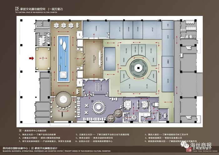 泛家居文化区泛家居文化区:整体设计通过模拟沙盘的形式结合电子大屏幕呈现泛家居平台的发展历程,以及泛家居平台未来的全球战略布局。