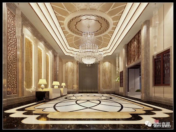 酒店大堂区酒店大堂区:整体设计采用高超的石材水刀拼花工艺和高水平的艺术装饰性完美结合,打造一个美感的体验空间。