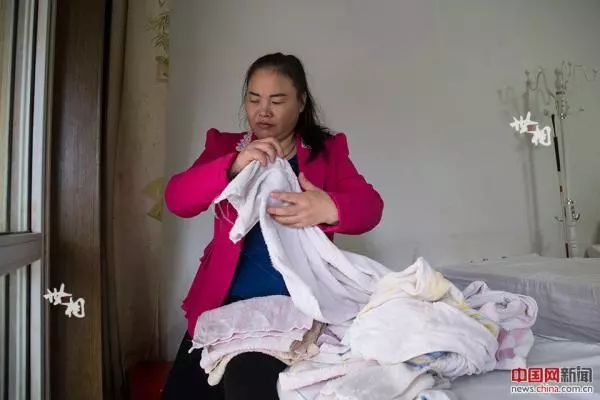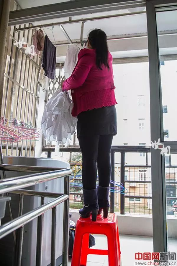 刘金枝站在凳子上将干净的毛巾收下来。