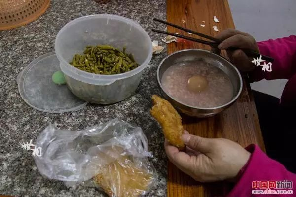 刘金枝回到家中,儿子阳阳已经将早饭做好,刘金枝拿出自己腌制的咸菜吃早饭。
