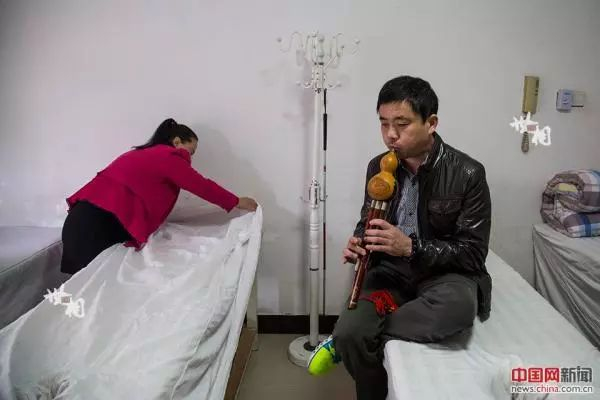 孙前军在闲暇时吹葫芦丝。