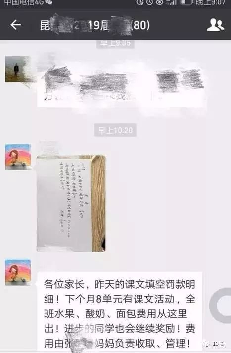 紧接着,这位老师还向家长公布,“下个月8单元有课文活动,全班水果、酸奶、面包费用从这里出!进步的同学也会继续奖励,费用由XXX妈妈负责收取、管理。”