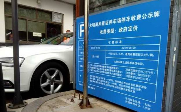 而在路对面的大明湖风景区停车场,蓝色公示牌上则清楚地标注着:2元/小时。