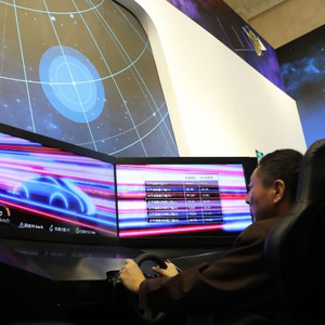 10月12日,一名观众在“砥砺奋进的五年”大型成就展上体验北斗高精度导航驾驶。新华社记者 张玉薇 摄