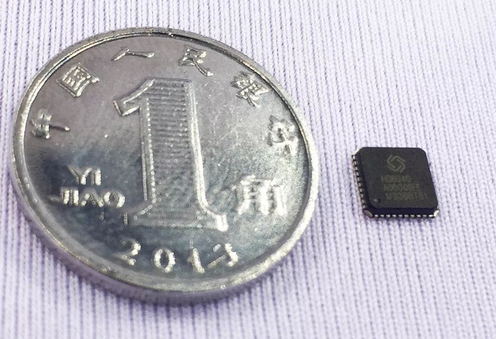 ▲资料图片:9月16日,全球首个支持新一代北斗三号信号体制的高精度导航定位芯片正式发布,这是芯片与一角硬币的对比照。