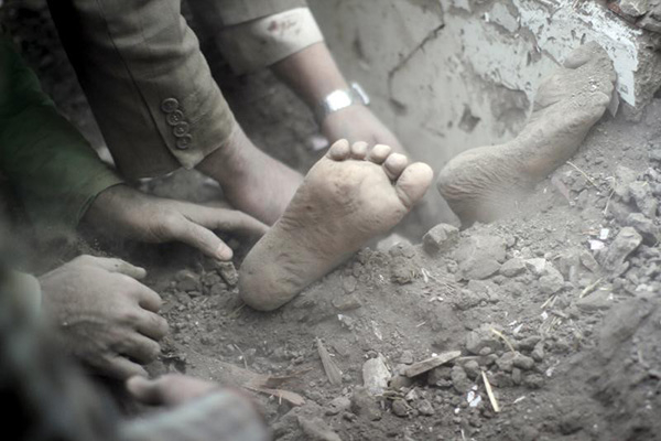 图为2015年9月,萨那的一次空袭后,一名儿童的脚被灰尘覆盖,人们正在废墟中搜寻幸存者。