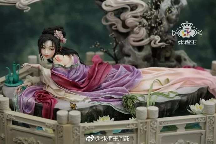 获得铜奖的《醉卧忘忧境》也未显逊色。一个古风美女俯卧在石阶之上,石下有湖水、莲花,身后有假山、青烟,手边还摆放着酒壶、酒杯,即使是几毫米的小花上都可看出细微的纹路。