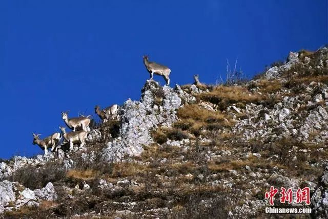 图为一群岩羊在山坡上觅食。 切嘎 摄
