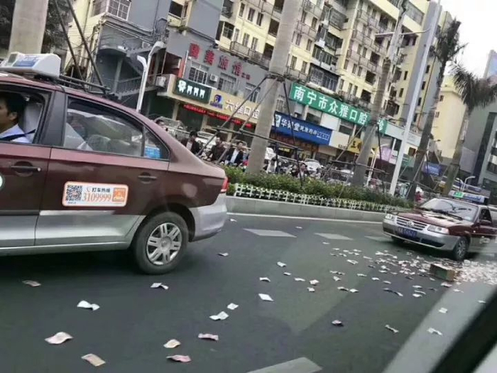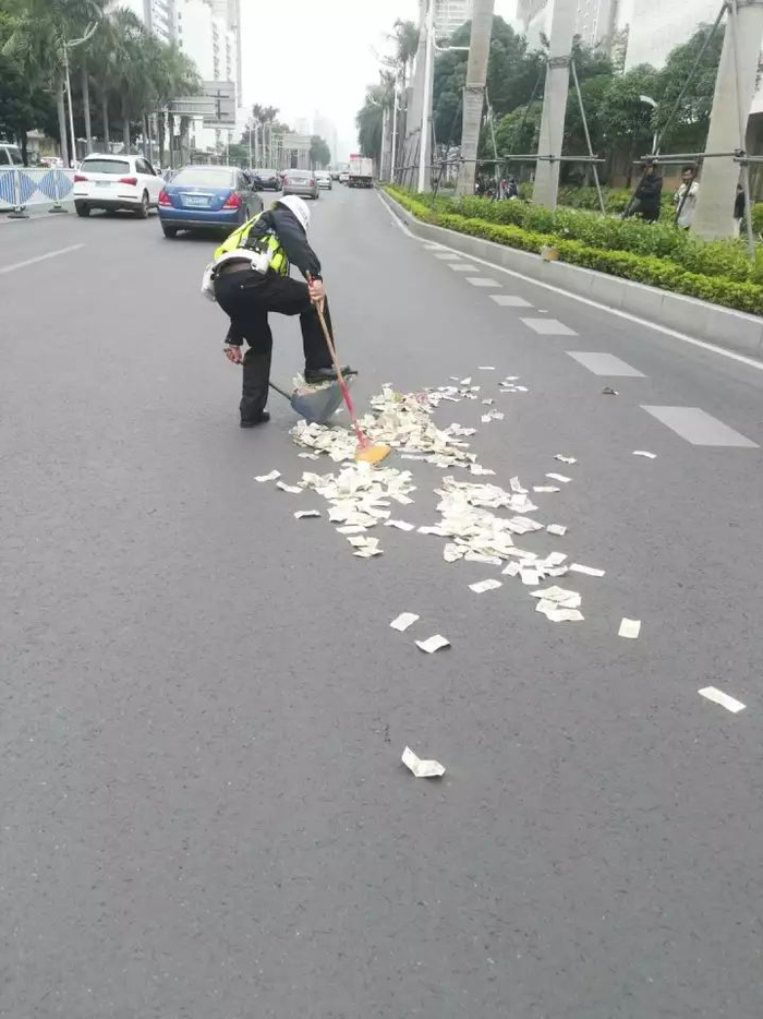 怎么回事?!南宁民族大道钞票撒落一地,交警动用扫帚来捡!