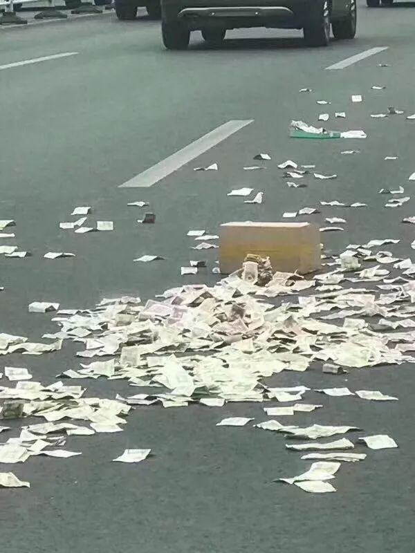 待余焕走近后发现,原来道路上有一个装着大量一元、五角、一角纸币的盒子,纸币散落一地,在过往汽车的带动下,随风起舞。