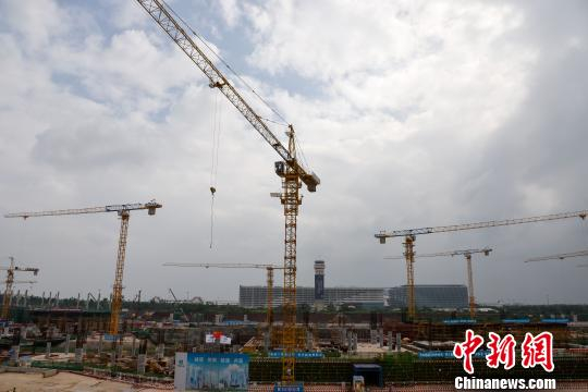 记者在美兰机场北侧的项目现场看到,塔吊林立,工人、车辆在加紧进行施工,能够清晰看到跑道以及停机坪等区域的轮廓。