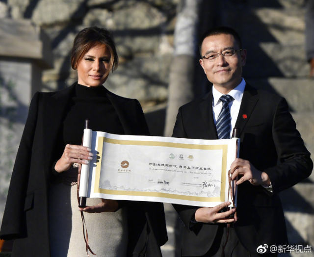 【美第一夫人登长城 获赠“好汉证”】11月10日下午,美国总统特朗普夫人梅拉尼娅登上慕田峪长城,获赠“好汉证书”。北风虽然凛冽,但蜿蜒的长城气势磅礴,引得梅拉尼娅流连忘返。(记者朱超、燕雁)
