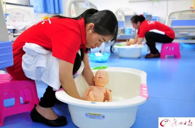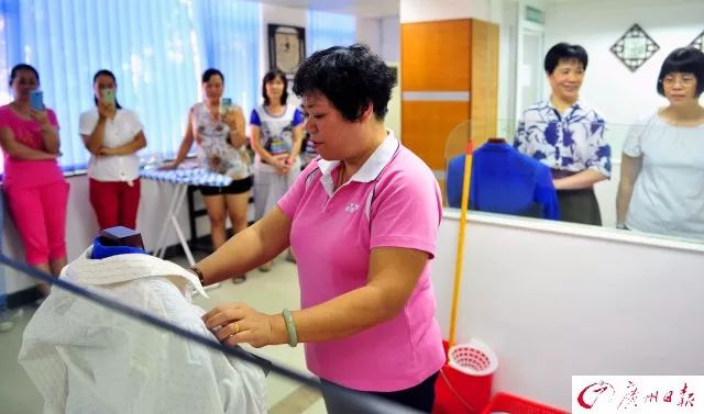 图为广州市妇联人力资源市场,参加家政培训班的学员观看老师的示范操作。 资料图/广州日报记者 廖雪明 实习生 刘兴宇 摄