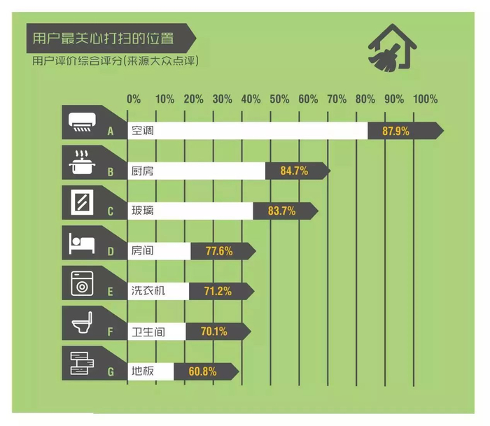 基于消费者评论数据的词频统计可以看出,在家居保洁这一方面,消费者比较关注空调和厨房等位置的清洁,对工具要求较高。其中关心空调清洁的占87.9%。关心厨房、玻璃的分别占84.7%和83.7%。