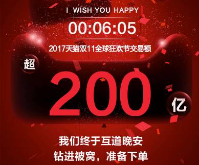 5分57秒,2017天猫双11全球狂欢节成交额超191亿元,已超2012年双11全天的成交额 ,无线交易额占比93%。