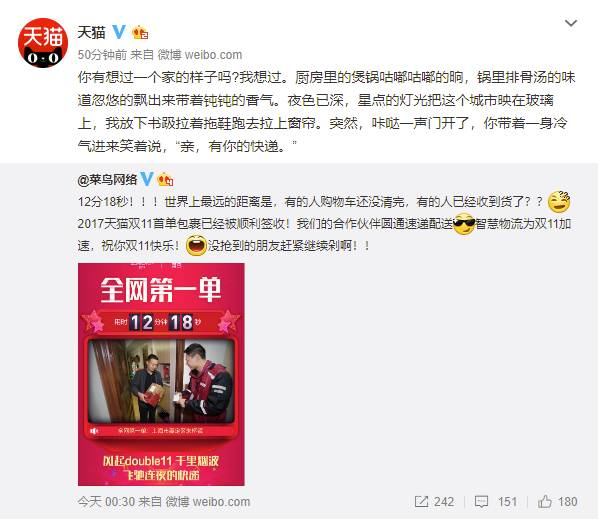 订单通过菜鸟智能仓配系统,由机器人和流水线根据算法自动完成拣选和包装。4分内商品就被贴上菜鸟电子面单后从仓库发出,12分18秒签收成功。当快递员敲响刘先生的家门时,他还在继续血拼。