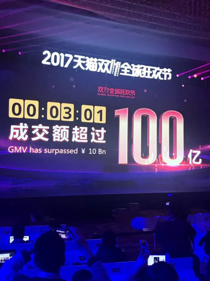 11月11日凌晨消息,据双十一实时交易数据显示,2017天猫双11全球狂欢节交易额在3分1秒超100亿元。