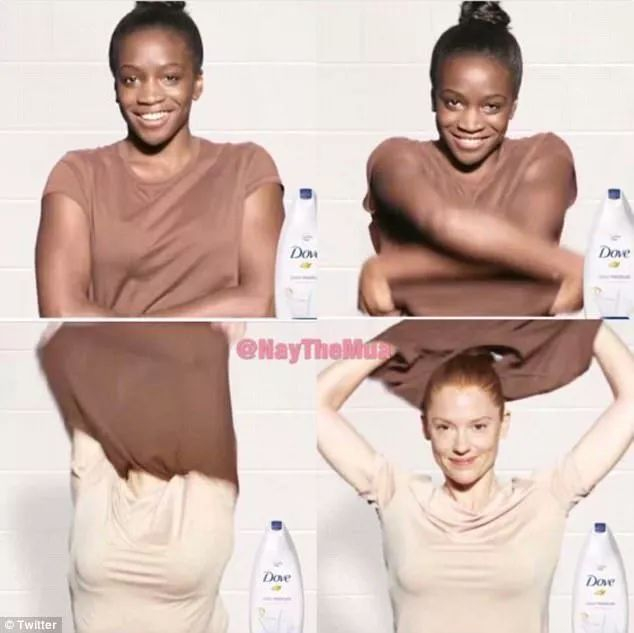 今年9月份,知名女性品牌多芬在社交媒体平台“脸书”(Facebook)上发布了一条沐浴露的广告。广告中,一名黑人女性在使用多芬的产品后,脱掉T恤突然变成了白人女性。据雅虎新闻,在广告播出后,成千上万的人在社交媒体上分享他们对该广告的愤怒,其中包括关于广告概念最初是如何被提出和获批准的,甚至分享抵制产品的消息,如“我再也不买多芬了,你们都认为我的棕色皮肤象征着污垢”。尽管多芬一再道歉,也未能平息众怒,很多网友仍然要求抵制多芬产品。