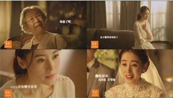 这则“因为爱不等待”的广告主打亲情牌,广告中,女主角回忆,从大学时代开始,每次见到外婆都被问:“结婚了吗?”岁月流逝,外婆缠绵病榻之时,最关心的问题仍然是其终生大事。最终,女孩穿着婚纱,拉着一位面目模糊的男性,含泪在外婆的病床前结了婚。