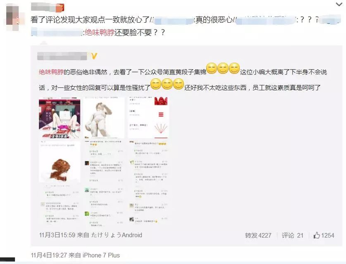 比如,就在绝味鸭脖进行公开道歉的第二天,绝味鸭脖官方微信推送了名为《我不搞预售,我就是玉兽》的文章,又刷新了公众的底线。文中打了码的大卫裸身雕像上,充斥着各种低俗不堪的内容。跟上述海报相比,这篇文案可以说是有过之而无不及,将各种性暗示进行到底。绝味小编还在评论区回复:“肮脏的眼里满是肮脏,纯净的的眼里满是纯净。”到11月8日中午,由于用户投诉太多,该篇文章已无法查看,但在此之前该文章阅读量已达到10万+。