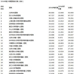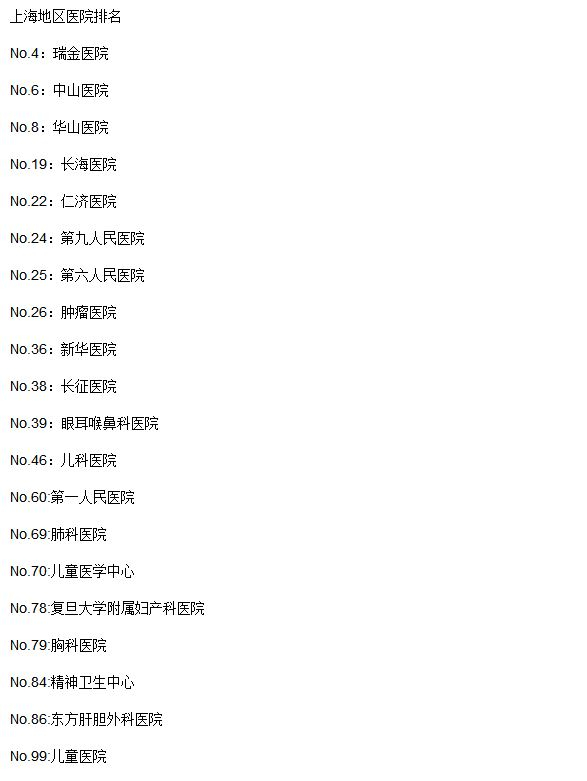 在全国医院综合排名百名名单中,上海3家医院入围前十,分别为上海交大医学院附属瑞金医院、复旦大学附属中山医院、复旦大学附属华山医院。除此之外,长海医院、仁济医院、上海市第九人民医院、上海市第六人民医院、复旦大学附属肿瘤医院、新华医院、长征医院、复旦大学附属眼耳鼻喉科医院、复旦大学附属儿科医院等总计20家医院均入围榜单。