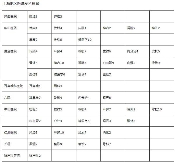 而在专科方面,上海多个医院优势学科摘取专科榜首。如复旦大学附属肿瘤医院病理科、复旦大学附属华山医院传染科和皮肤病科、复旦大学附属眼耳鼻喉科医院耳鼻喉科、瑞金医院内分泌科、复旦大学附属儿科医院小儿内科、上海市第九人民医院整形外科等。