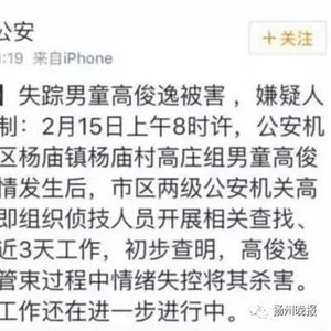 2月15日,邗江警方接到报案,说杨庙镇杨庙村6岁男孩高俊逸失踪!家人寻找无果,焦急万分。高俊逸的爷爷告诉民警,事发时孩子奶奶去买东西,妈妈上楼一会,孩子在楼下,妈妈再下楼时发现孩子已经不见了。