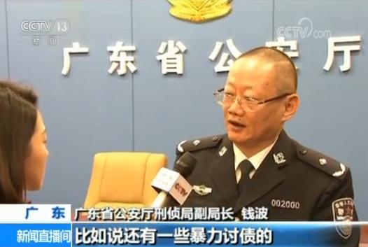 广东省公安厅刑侦局副局长 钱波:除了刚才说的打击农村黑恶势力之外,比如说还有一些暴力讨债的,民间非法的借贷,高利贷,然后通过借助暴力或者软暴力进行讨债。犯罪分子甚至把这个暴力讨债伸到校园里去,利用一些未成年人辍学的一些青少年参与暴力讨债。我们高度重视,及时出手把这些团伙打掉。