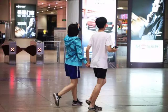 一对小年轻牵着手走向安检口