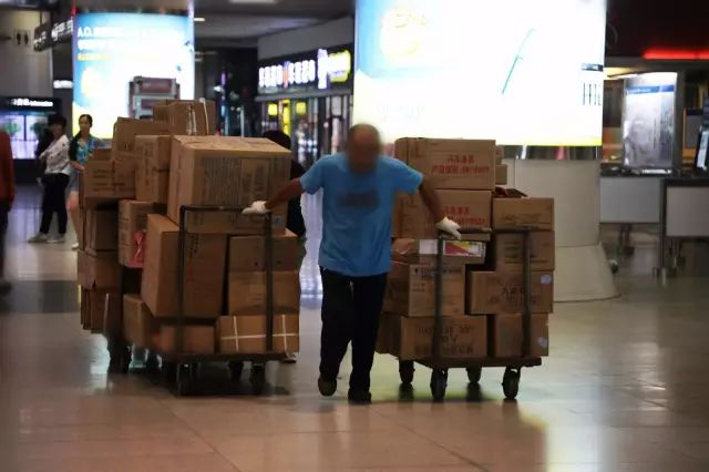 北京南站,中年男子麻利的装货、卸货