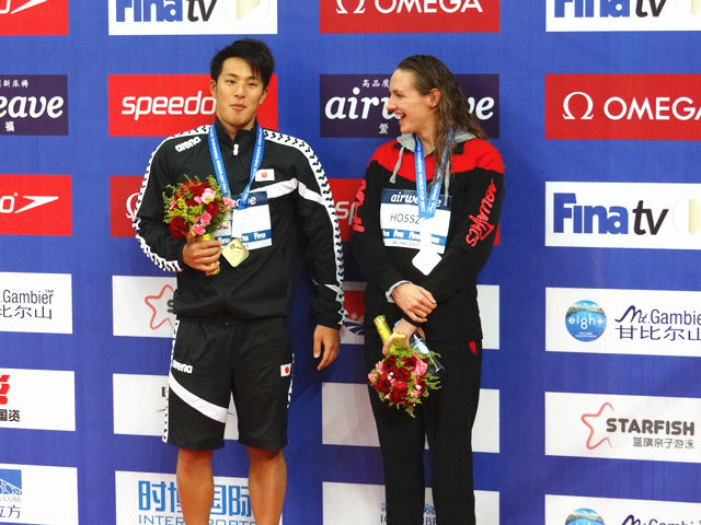 不同项目的获奖者站在一起聊得很开心,霍苏和日本选手濑户大也这就聊上了 刚出世界杯赛事新政的消息时,匈牙利名将霍苏曾经强烈抨击,因为限制选手参赛项目严重影响了她个人的“赚钱大业”——由于她技术全面,每站比赛都参加10个以上单项的比赛。但是从世界游泳发展的角度,由于“抢钱姐姐”的存在,一定程度上降低了短池游泳的魅力,打击了众多顶尖女选手的参赛积极性,减少了新人亮相锻炼的机会。